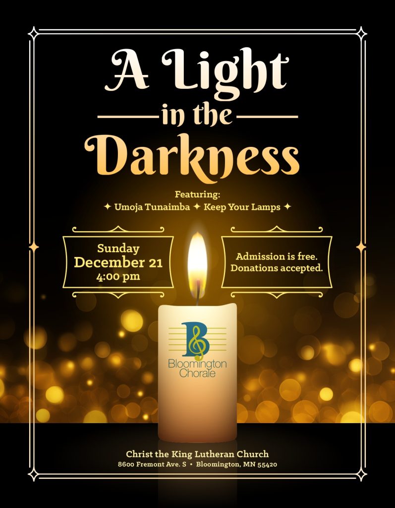 The Chorale is a fun and welcoming group that would love to have you join! Rehearsals are on Monday nights at the Bloomington Art Center. As one current member commented, “I came for one session 9 years ago and it was so fun, I’m still here.”